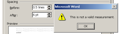 There is a wonderful analysis of 'an error message from Microsoft Word' (97 in fact), using the book's Heuristic Rules to good effect. When you have put in an invalid line measurement (eg if you type in '0.5 lines' rather than '0.5li'), which you aren't prevented from doing, you get the scary warning "This is not a valid measurement", complete with bright yellow warning triangle containing a big exclamation mark -- an oddity, as the rest of Word 97 is pretty friendly. It fails on at least 5 of 9 heuristics, and some of the others are a bit doubtful too.