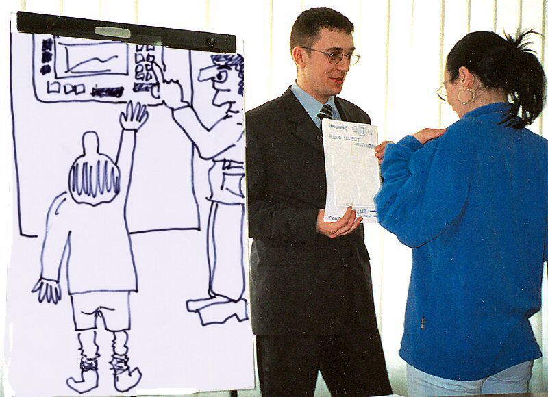 Direct use of Improvisational Theatre (“Improv”) techniques is also possible (scenarios, role-plays...); or, Improv can be used as a training aid for better team-based innovation performances. Simple techniques such as acting a scenario around a flipchart model of a user interface can be very effective.