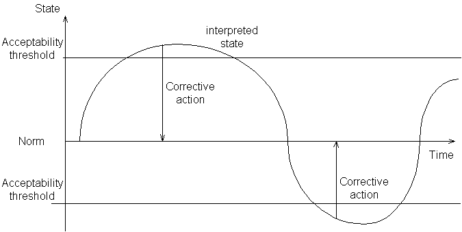 The process implied by Cannon’s principles can be represented in a diagram such as Figure 1. Whenever a change is detected in a variable, a corrective action is automatically taken. The stable state, maintained by the homeostatic system, is usually called a norm (Vickers 1987; Liu 2002). Hence, Vickers defines a norm as a (1987, p. 14) "governing relation by which the actual course of affairs may be judged." In this context the desired state, the norm, represents the goal of the corrective actions.