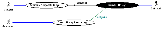 This opens the way to a game-playing or MiniMax view of business processes. Both the organization and its opponents (such as criminals and business rivals) act intelligently to discover and play their best move, which is – as in games like Chess and Go – whatever best counters their opponent's best move. To model the resulting zigzagging arms race between the players, Alexander proposed two new relationships, threatens, and mitigates (Alexander 2002b, 2002c). A Misuse Case is relevant only if it threatens the goal of a Use Case in the same model. Analysis may reveal one or more candidate counter-measures to the threat, and these may be documented as lower-level Use Cases that mitigate the threat posed by the Misuse Case (Figure 6).