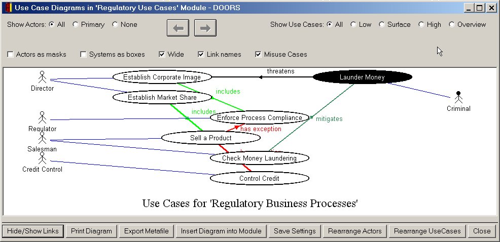 The primary and exception scenarios reveal much more detail than can be shown on a use case diagram, which merely illustrates the context in summary form. Each row of the table in Figure 8 represents one DOORS object, such as a scenario step or a structural heading. Scenario Plus enforces a specific set of meanings on the structure – for instance, underscoring indicates the name of a 'target' use case to be linked to (by the analysis tool). A link from a primary scenario to another use case is assumed by the analysis tool to be an inclusion; one from an exception scenario is similarly assumed to be an exception link; while a reference to a Misuse Case from a Use Case is assumed to be a mitigation. These rules greatly reduce the amount of effort needed to set up a model. Essentially the analyst is freed to think about the structure of the business processes, and in most cases can leave tasks like linking to the toolkit.